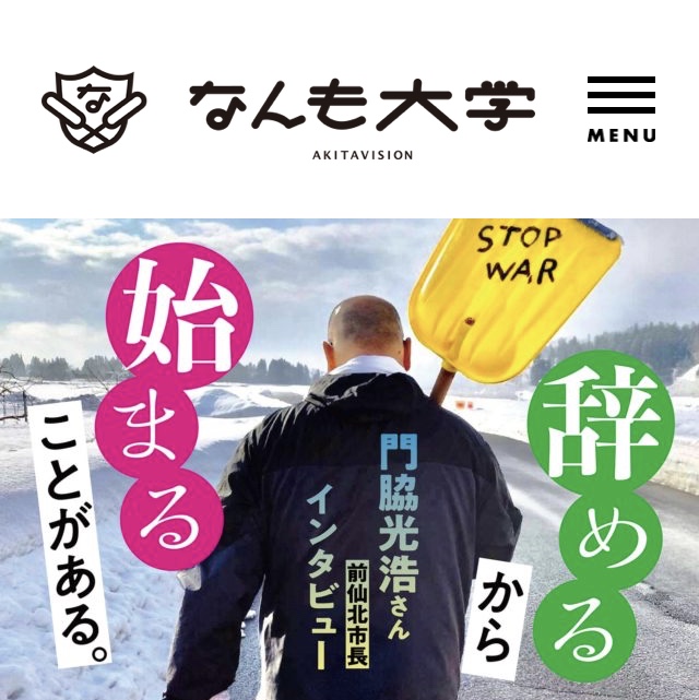 同編集長の藤本智士さん、スタッフの皆さんには、フリーマガジン「のんびり」やこの「なんも大学」などで、秋田の良さと課題を掘り出してもらいました。読み手の皆さんに発見や気づきが多く、また挑戦者には勇気を分けてくれました。長い間お疲れ様でした。ありがとうございました。